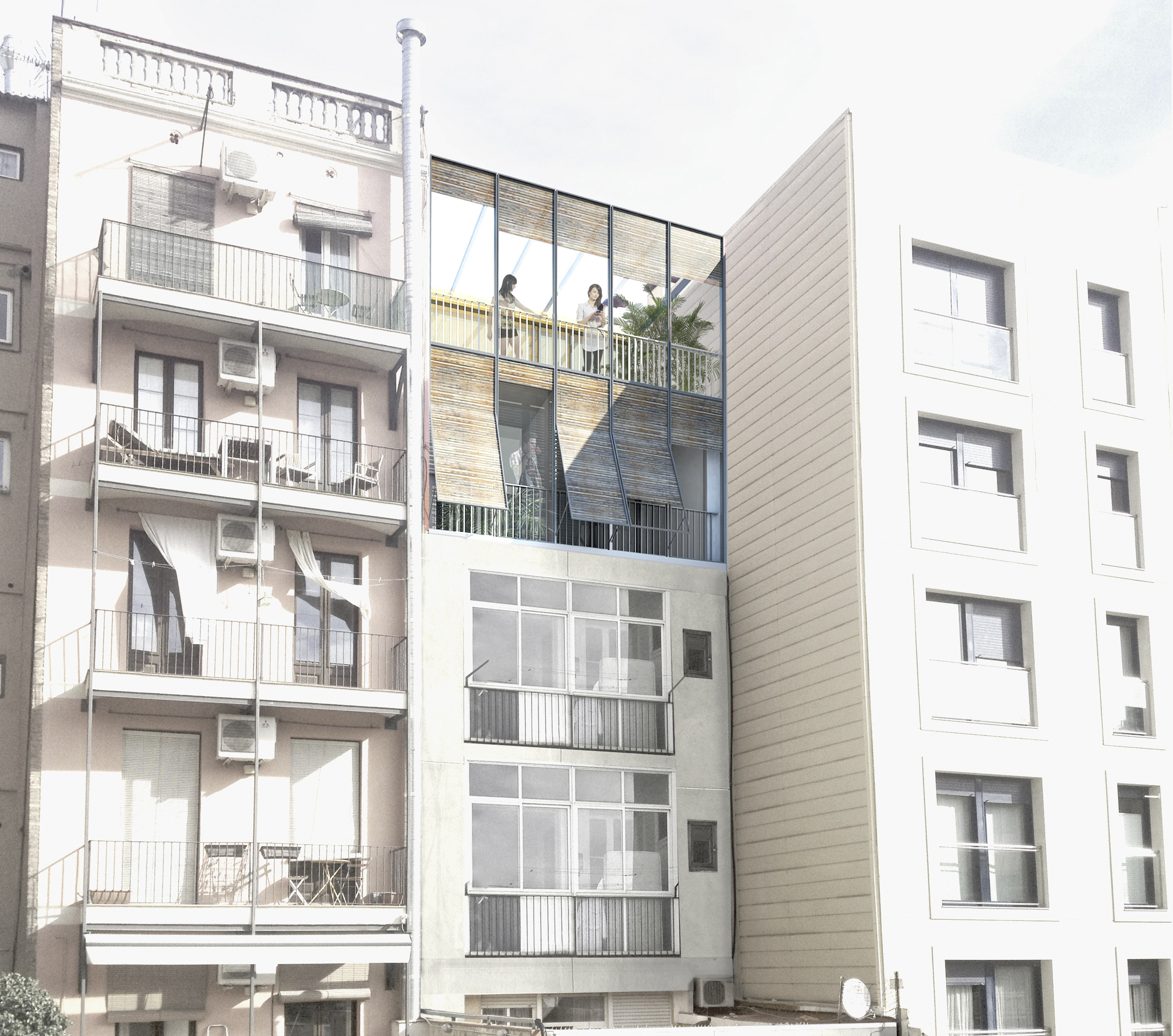 EG69 is the first of a series of highly sustainable penthouse apartments that will be built in the central Eixample of Barcelona. The developer -La Casa por el Tejado- started construction of steel structure 3d modular penthouse apartments in the unused urban pockets of the central example in 2013. EG69 will be the first project designed using 2d assembly light laminated wood frame system and semi-passive house insulation achieving an A level in energy efficiency rates.