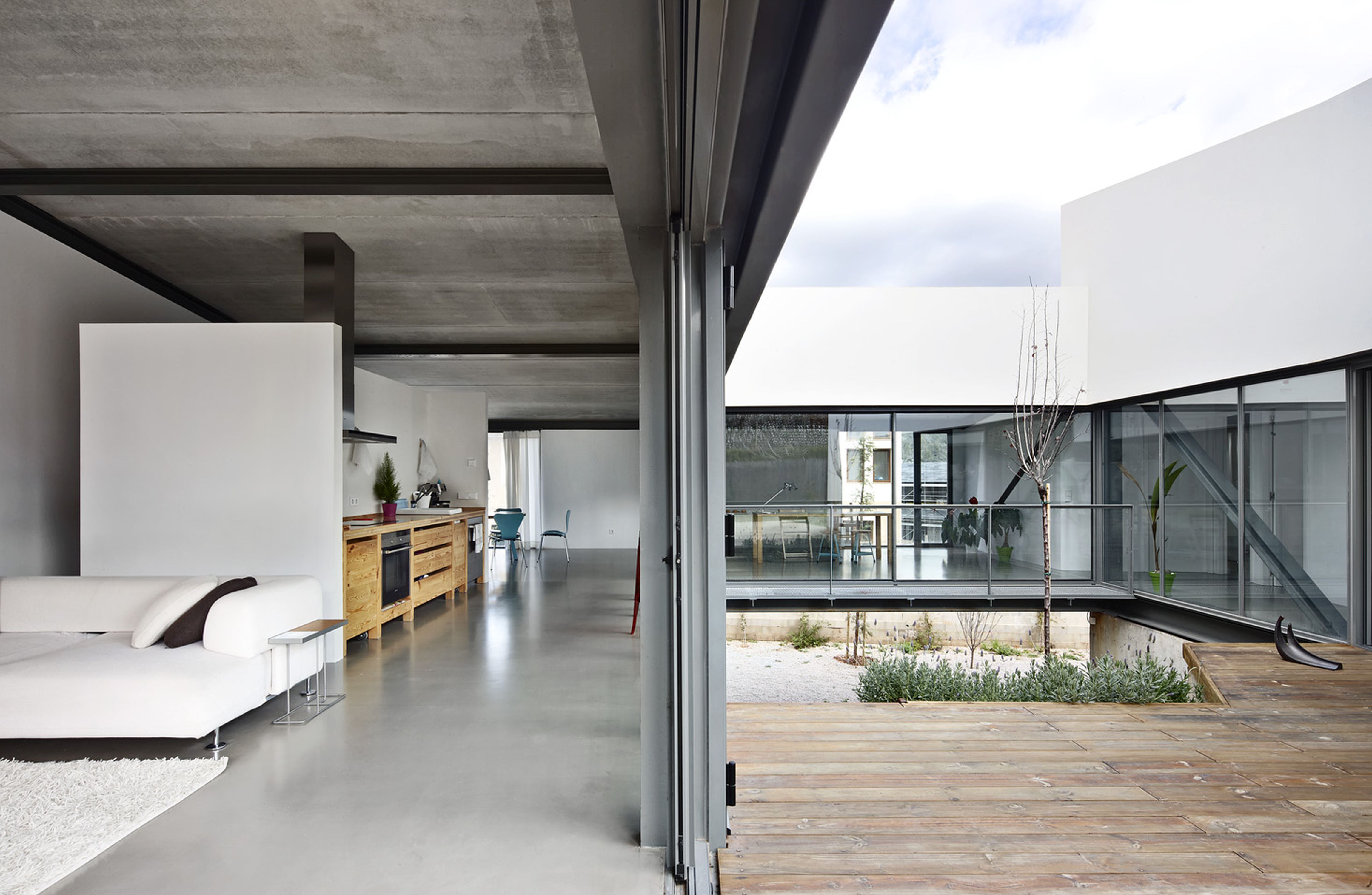 Occupying a steep plot in a typical garden-city suburban fabric, this house takes advantage of the site conditions to transform a classic patio house typology into a continuous space that connects the two levels by merging the garden and the indoor domestic space.